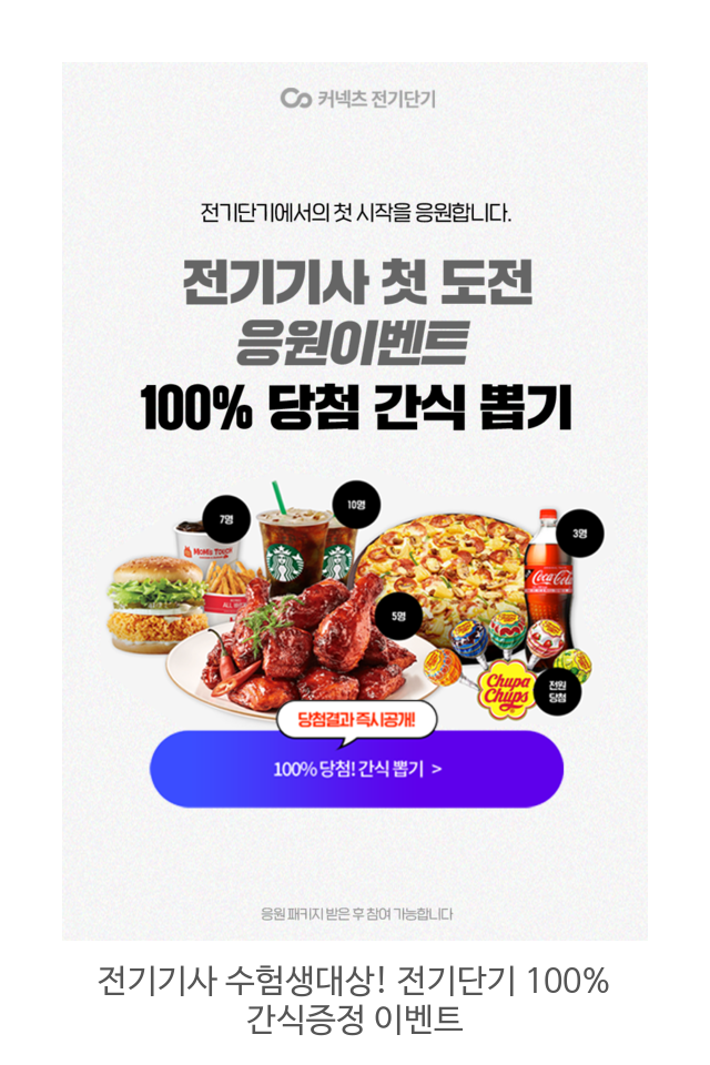 전기기사 공부 많이 어렵죠? 커넥츠 전기 단기에서 전기인을 꿈꾸는 왕초보 전기기사 수험생들을 위해 응원 이벤트를 준비했습니다. 지금 전기 단기의 ""첫 도전 응원 패키지"" 페이지에서 기초수학 강의 무료로 받고, 100% 당첨! 간식 뽑기 이벤트에도 참여해보세요 : )