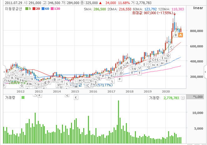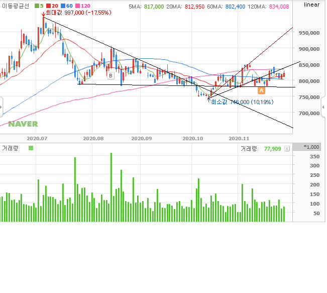 그래서 지금의 주주는 그 시점까지 홀딩을 계획하고 있겠지만, 신규 주주는 언제가 매수 시점일 것인가를 예상해봐야 한다. 일봉만 본다면 780,000~850,000 사이를