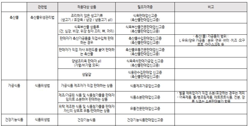 하지만, 2019.06.12 자로 「축산물 위생관리법 시행령」 제21조 제7호 가 목에서는 「전자상거래 등에서 소비자보호에 관한 법률」 제2조 제3호에 따른 통신판매업자가 닭/오리의 식육 또는 포장육을 판매하는 경우(판매할 때 보관/관리 또는 배송을 식육판매업 또는 식육포장처리업의 영업자에게 위탁하는 경우로 한정한다) 식육판매업 영업신고에서 제외하게 되었습니다.
