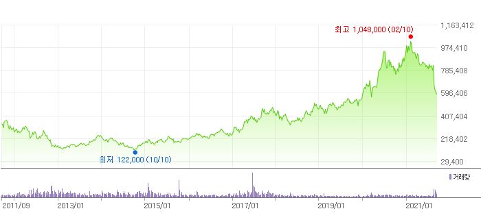 다음 저항자리인 50만원대가 깨진다면, 10년 전의 주가로도