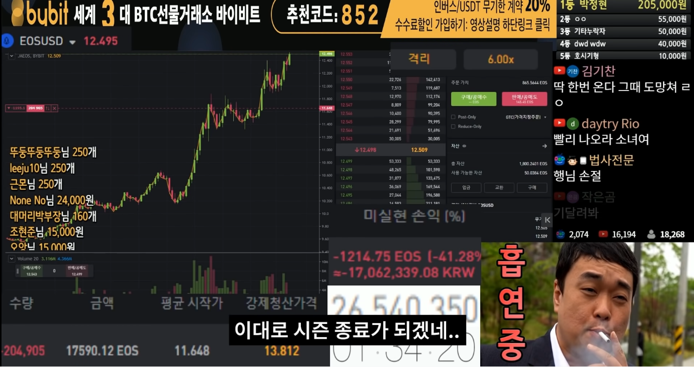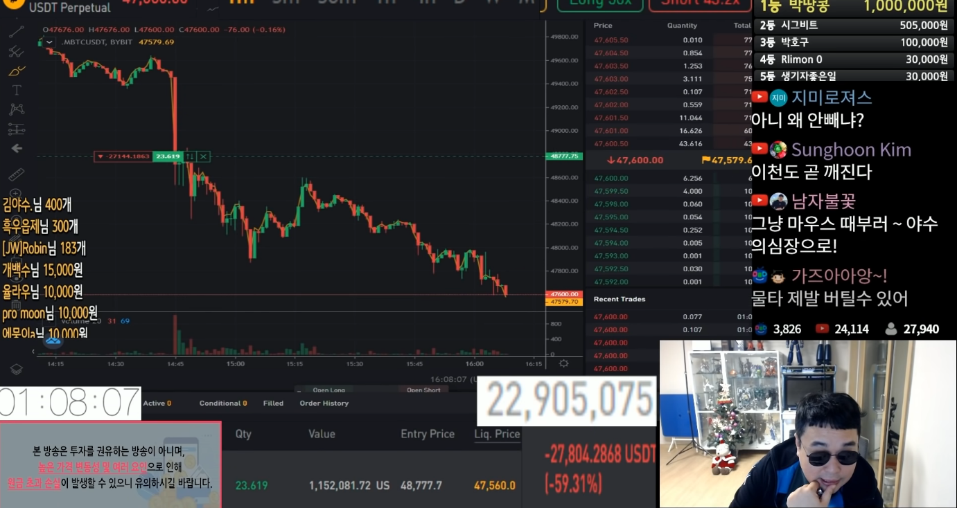 Starting with overseas futures, he is currently showing a pleasant and bold investment in bitcoin futures, receiving a lot of interest and love from investment users in Korea and abroad. He is losing money on a daily basis, but since his source of income is not Bitcoin, I don't think there is anything to worry about. Viewers who are struggling a lot with Bitcoin are looking for fun and healing through Park Ho-doo's broadcast. So I'd say he's like a piece of equipment. He is a very pleasant and fun person. I also enjoy watching his shows on a regular basis.