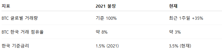 2021년 불장 당시 한국 개인 투자자들은 글로벌 현물 거래량의 약 **8%**를 차지했지만, 현재 그 비중은 3% 수준으로 크게 낮아졌다. 많은 국내 투자자들이 알트코인 손실에서 아직 벗어나지 못하고 있다는 신중론이 나온다.